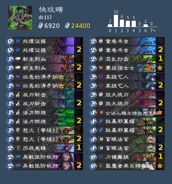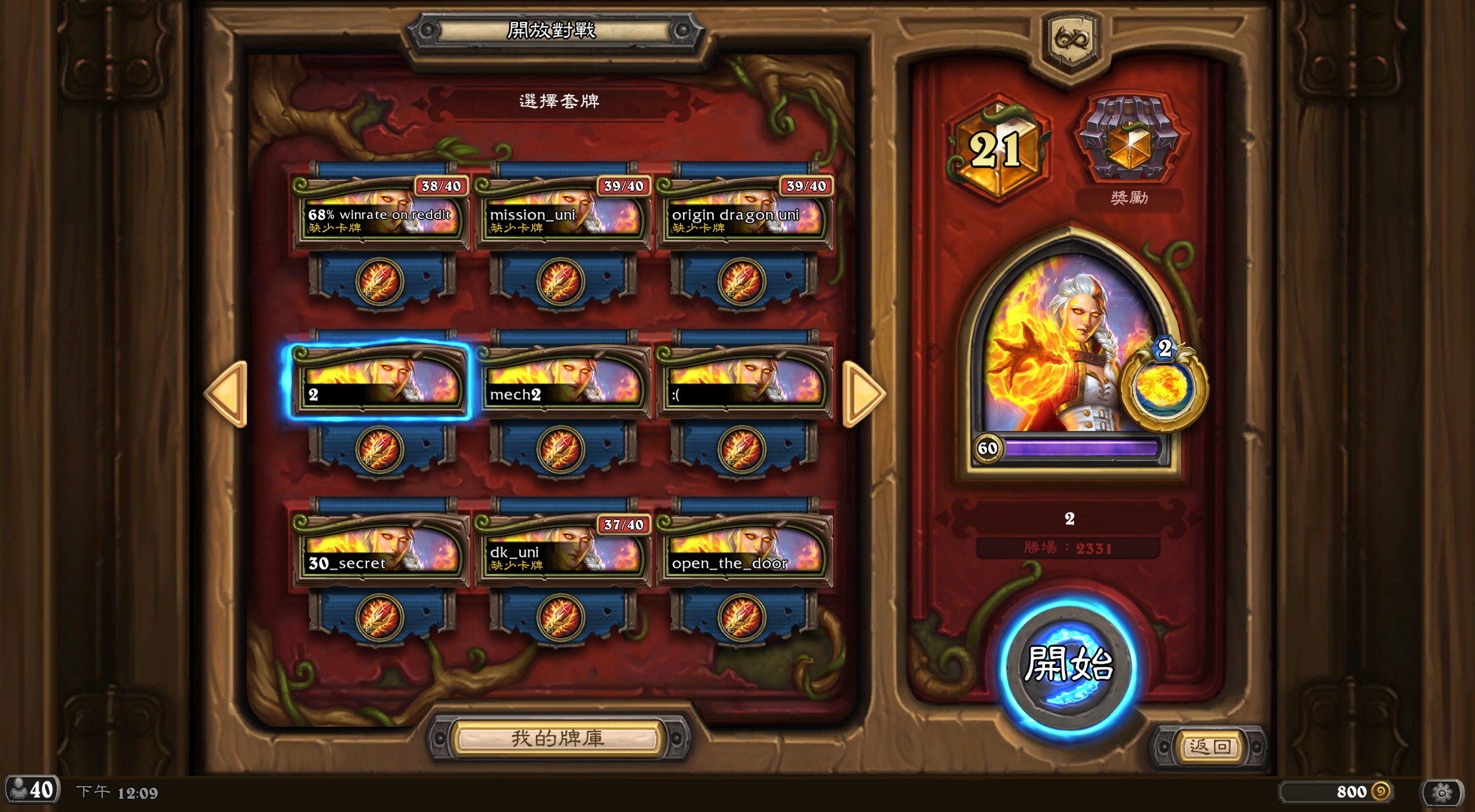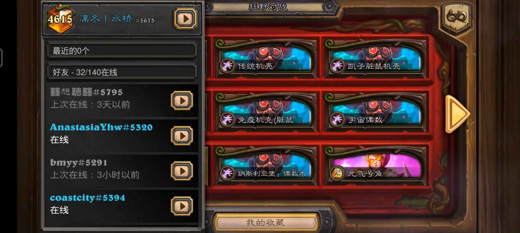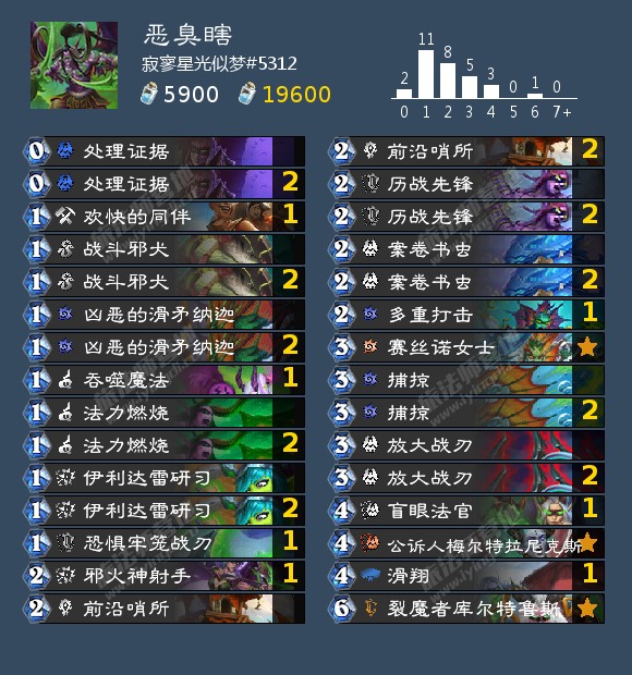 今天的卡组有快攻瞎、宇宙术、宇宙暗牧、机克术、恶臭瞎、宇宙控制法、铁拳术。