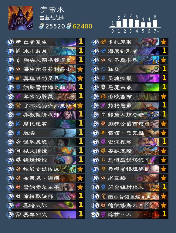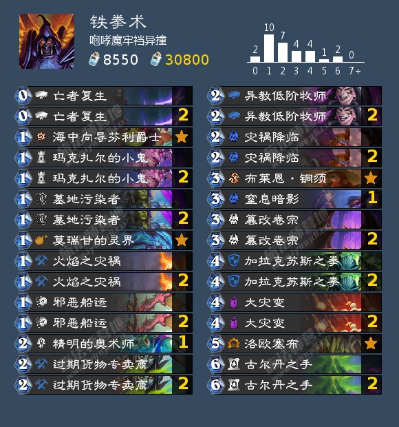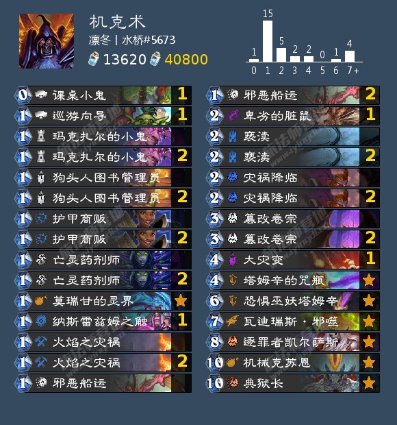 来自凛冬丨水桥#5673的一套典狱长机克术,他使用这套卡组以10倍星加成141场54%胜率打上传说。
