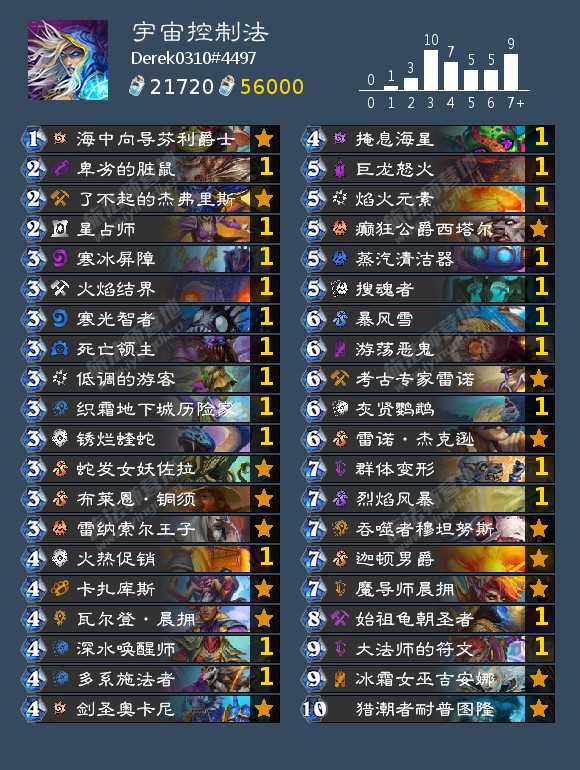 来自Derek0310#4497的宇宙控制法,他使用这套卡组在亚服以78胜41败66%胜率打到第116名 (月初第二天上传时是第21名)。