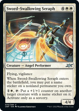 【规则】先攻。此生物进战场时,你可以在其上贴一张姓名贴纸。反相同首字母保护(此生物不能被与贴在它之上的姓名贴纸首字母相同的东西阻挡,指定为目标,造成伤害,结附或是装备。)