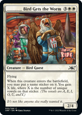 【规则】飞行。当此生物进战场时,你可以在其上贴一张姓名贴纸。你获得X点生命,X是这张贴纸上的独有的元音数量。(元音是A,E,I,O,U和Y。)