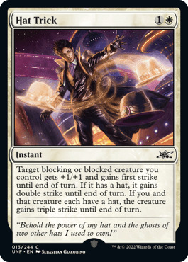 【规则】直到回合结束,目标由你操控的阻挡中或被阻挡的生物得+1/+1且获得先攻异能。如果此生物有帽子,直到回合结束,它获得连击异能。如果你和此生物分别各有一顶帽子,直到回合结束,此生物获得三击异能。