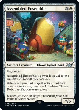 【规则】警戒。~的力量等于由你操控的机器人的数量。当你施放一个画面中包含一个神器生物的咒语时,派出一个1/1白色小丑机器人衍生神器生物。