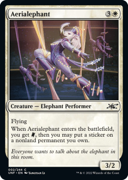 【规则】飞行。当~进战场时,你获得[门票],然后你可以将一张贴纸贴在你拥有的一个非地永久物上。