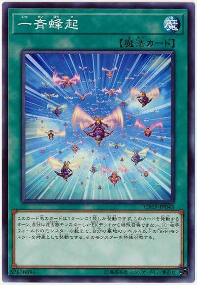 ①:以最多有对方场上的怪兽数量的自己墓地的4星以下的「蜂军」怪兽为对象才能发动。那些怪兽特殊召唤。