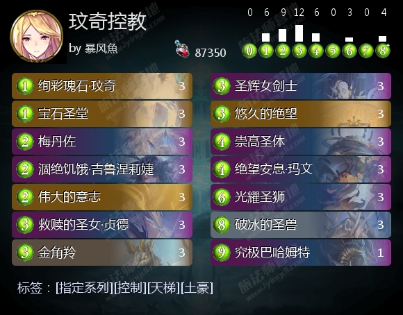 控教是围绕进化体系运作的控制,擅长回血、解场,还拥有减伤效果,能通过瞬念召唤涸绝饥饿·吉鲁涅莉婕、究极巴哈姆特带来巨大的资源优势,进而取胜。通过多张爆能圣辉女剑士完成斩杀,在实战中也很常见。