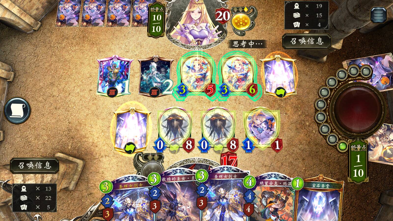 后期优先通过爆能圣辉打斩杀。圣体也可参与斩杀。无法做到的话,通过瞬念召唤吉鲁涅莉婕或究极巴哈姆特建立资源优势取胜。