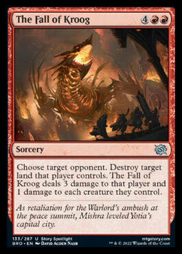 选择目标对手。消灭目标由该牌手操控的地。~对该牌手造成3点伤害,然后对其操控的生物各造成1点伤害。