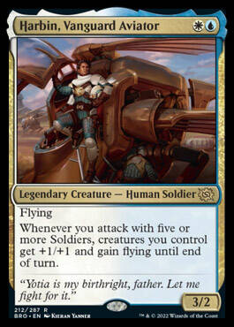 每当你以五个或更多士兵进攻时,由你操控的生物得+1/+1和飞行直到回合结束。