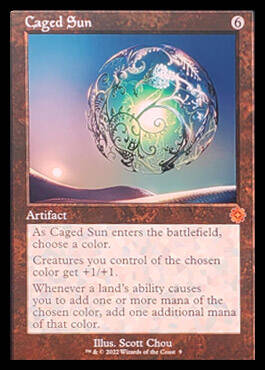 当~进战场时,你和目标对手各派出一个横置的魔力石衍生物。