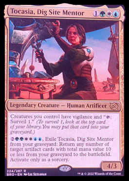 7:检视你牌库顶的4张牌。你可以从中展示一张神器牌,并将之置于你手上。将剩下的牌以随机顺序置于你的牌库底。