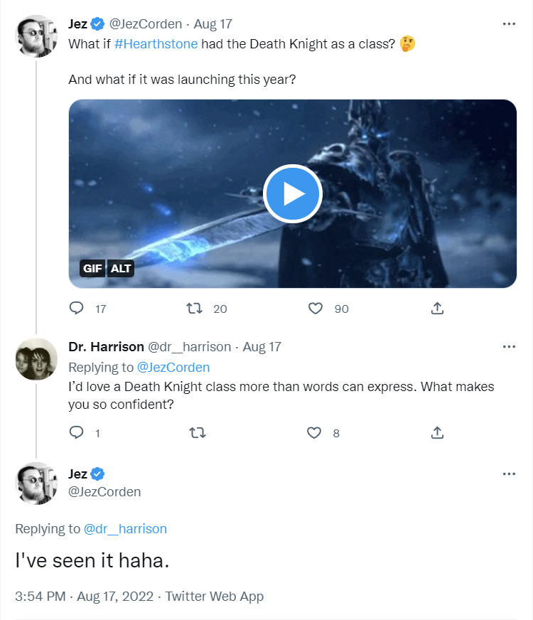 死亡骑士作为炉石新职业的爆料最早来自媒体人Jez Corden,他早在8月份就声称炉石今年内就会出死骑,说他“看到过了”。不过他也只是这么一说,这个传闻的真实性只建立在他个人的信誉上——但据知情人士介绍,他的爆料履历确实是信得过的。