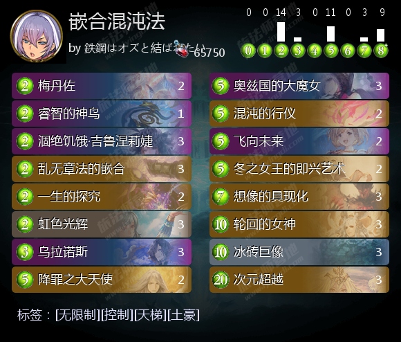 混沌法是围绕混沌的行仪、想像的具现化运作的思路,依靠被混沌、想像减至低费的次元超越或其他高费牌取胜。传统的混沌法往往会精简法术种类,并投入魔法图书馆等检索手段,以追求第5回合准时混沌,并在下回合用出超越。不过,在目前这个节奏极快的环境中,第5回合“空过”往往意味着活不到下回合,因此更推荐尝试本文介绍的这个偏控制版本。