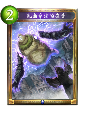 在对狂乱鬼等前期解场压力大的对局中,如果手中有乱无章法的嵌合,且有足够的法术和随从触发其抽牌、解场效果,则不必着急过牌,等到使用嵌合后再寻找中期关键牌。对骸王死等可能会在前期发难,也可能会拖到中期才发力的对手时,则要做好两手准备,避免出现没有机会使用嵌合且无事可做的尴尬情况。