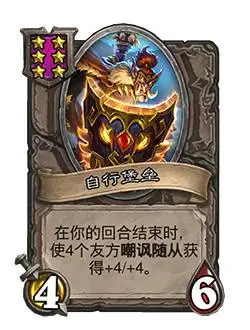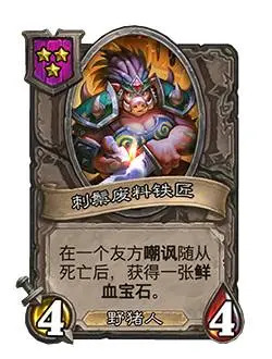 另外一张特别想说的是这个替代宝石切分者的废料铁匠,嘲讽死后给一个血宝石,这张牌本身可能看着一般,我在预测的时候说肯定是比切分弱了,不太适合圣盾激素流了,但上线后发现这个版本还有几张新卡,都是嘲讽的,还有张26能+8血贴嘲讽,野猪预言者也改成了嘲讽,以前也还有32贴嘲讽的手段,导致这个版本一下子好多嘲讽,3本来一张这个废料铁匠,宝石爆的比以前切分者都多,毕竟圣盾怪比嘲讽少很多,中期很容易依靠这1张卡比别人身材大一圈,无脑打宝石上本打宝石上本,一边上本一边还能揍人,6本出张自行堡垒就可以继续玩嘲讽流或者暗示**也能转型野猪人