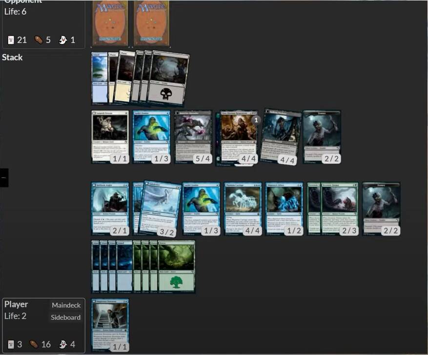 如果血量健康时选择全踢叫杀被对手一个去除苟住了也无所谓,接着打就是;如果自己血量也很低时就要更谨慎。来看一个游戏到了中后盘的实战例子吧——场面很大,我和对手都有一堆生物,对手6点血,我只有2点血。在这里需要特别小心,看似我全踢就可以斩杀了,而对手有一张回手我就崩了。当双方都有很多生物时这种胜负逆转尤其明显。