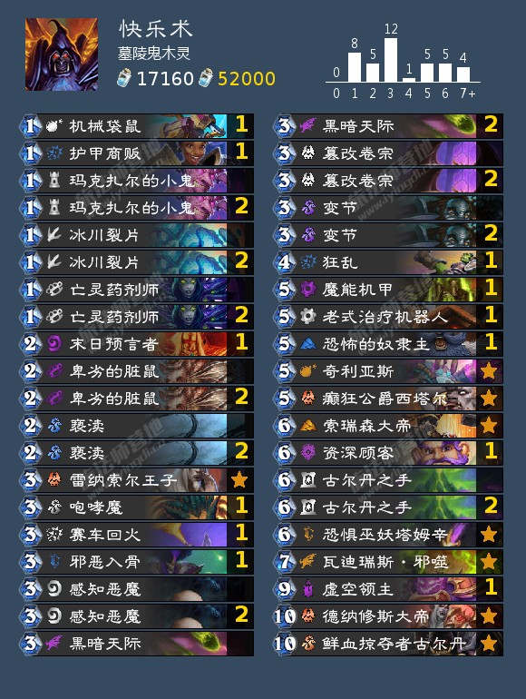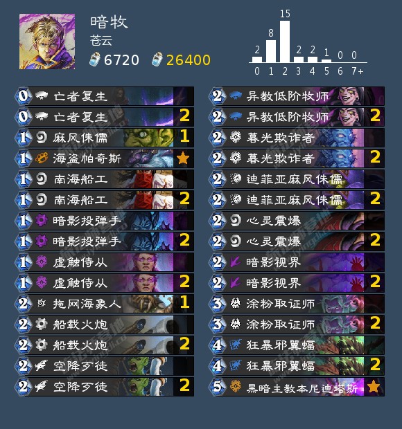 与之前的不同主要是1费随从的选择,去掉了强调站场的滑矛和11圣盾嘲讽,转而携带解场和污染效果更佳的孢子与补刀突袭一体的改装师,这两卡配合生平、巴罗夫领主能小优前期造大哥的卡组,如奇迹贼和大哥牧(碎骨:真的很有想法)。此外,为了补充前期的嘲讽,携带了晋升和监狱守卫。卡组总体打法没太多可说的,想玩的老哥可以抄去休闲先试试手感。