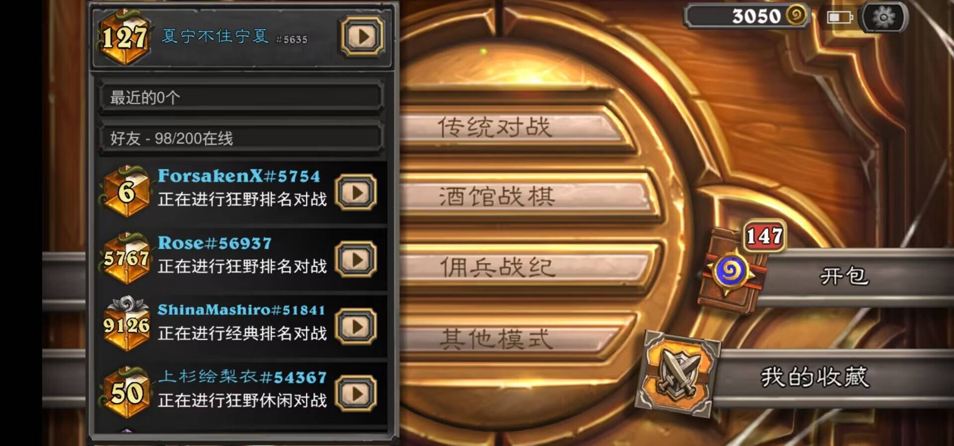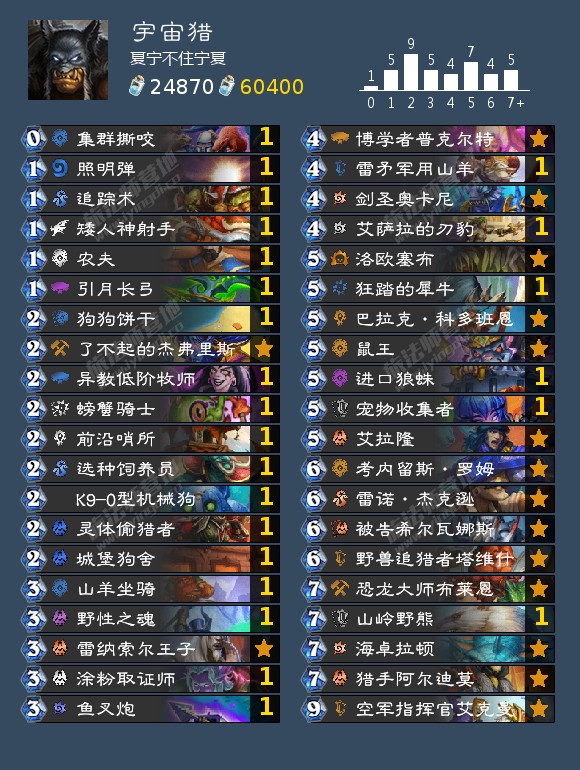 来自夏宁不住宁夏的宇宙猎,它使用这套卡组打到了127名,据说最近的胜率不错,但是插件只能看到总战绩129场50%胜率。
