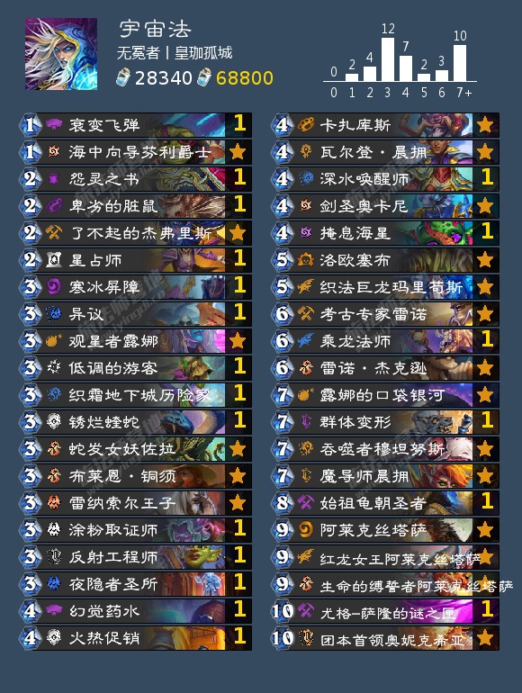 来自无冕者丨皇珈孤城的宇宙法,它使用这套卡组以24胜8负75%胜率的战绩打入前百。