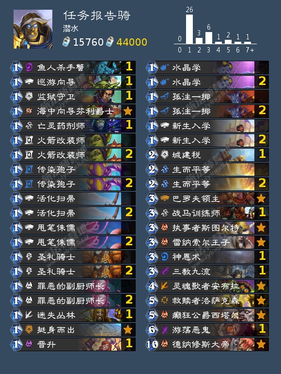 潜水老哥在上个月也投过报告骑卡组,这套卡组经他之手,修改了3个月,包括调整在内共计292场59%胜率。