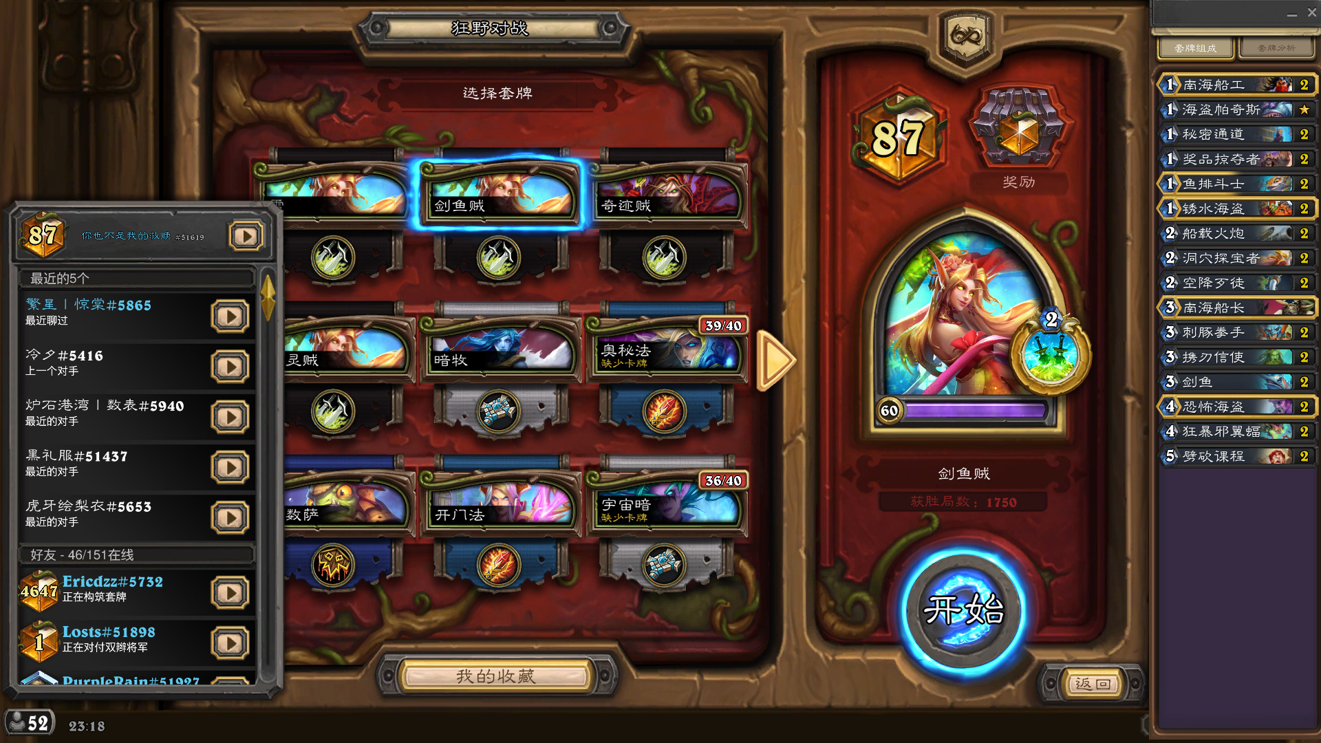 今天的卡组有宇宙法、宇宙猎、任务报告骑、快攻暗牧、快乐术、剑鱼贼。