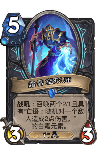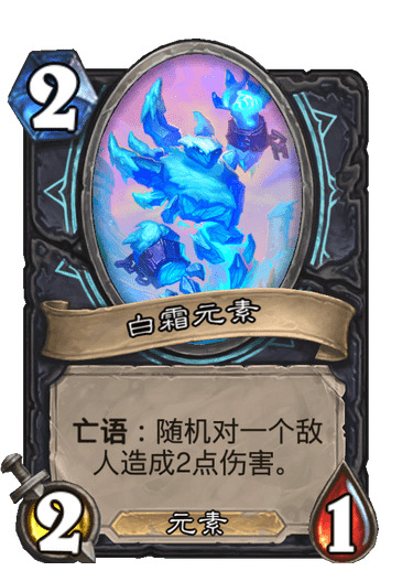 战吼:召唤两个2/1且具有“亡语:随机对一个敌人造成2点伤害”的白霜元素。