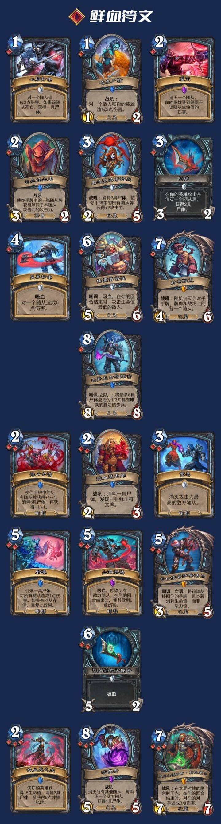 三邪符文则是全方位的加强:简单粗暴的一费4尸+延迟的4个22,彻底解决了尸体不够用的问题;4费永久生效的嗜血可以给每波小场面附加威胁,8费掀桌子牺牲了后期消耗尸体卡的价值换一波巨大的场面,面对节奏卡组价值很高。