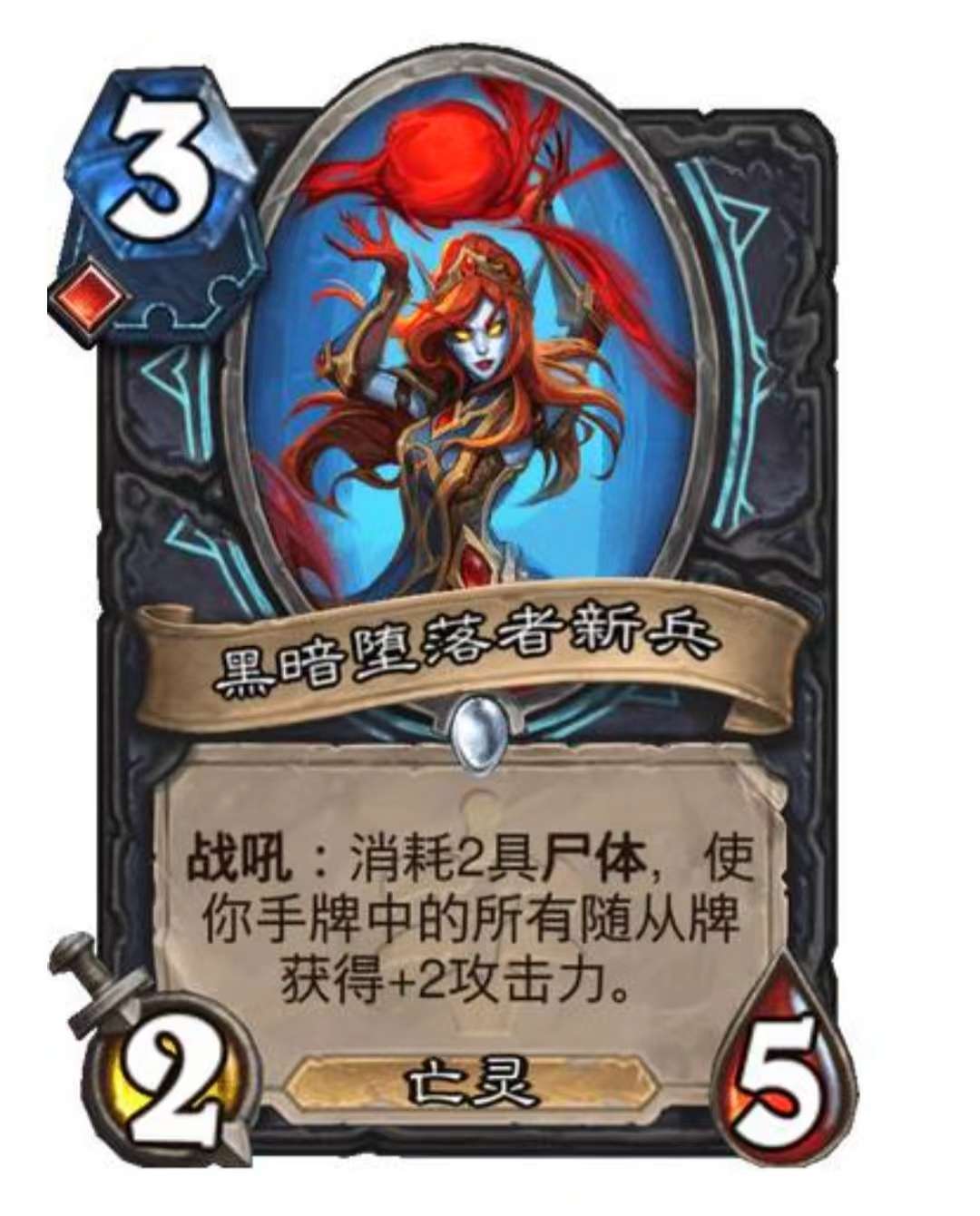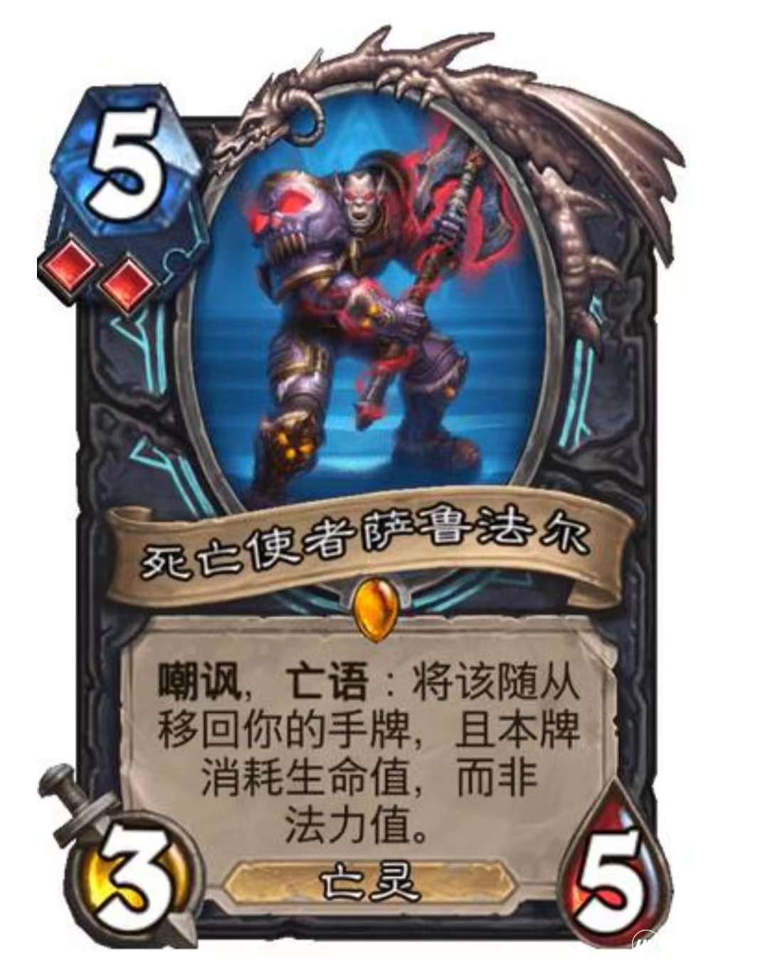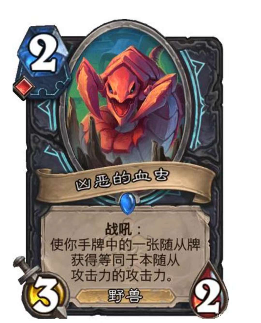 点评:适合于剑宗dk使用的一张卡,虽然没有毒鳍龙那样的直接战吼,但+2攻击力这个可观的战吼效果可以结合邪恶符文卡牌构筑成为快攻卡组
