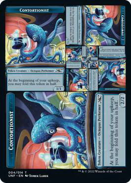 【规则】当~进战场时,派出一个名为柔术演员的4/4蓝色章鱼表演者衍生生物。它是具有「在你的维持开始时,你可以将此衍生物牌对折」的生物。(它将变为2/2,再变为1/1,再变为0.5/0.5,以此类推。)牺牲~:抓一张牌,且柔术演员每被折一次便额外抓一张牌。