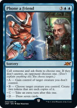【规则】给某人打电话,让此人选择一项。若此人没接电话,由一位对手选择一项。(不要在电话里作任何额外说明。由你来选目标。)A——获得目标不由你操控的生物的操控权。B——选择目标由你操控的生物。派出两个此生物的复制品衍生物。C——于本回合后继续进行额外的一个回合。D——抓七张牌。