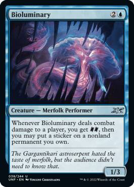 【规则】每当~对任一牌手造成战斗伤害时,你获得[门票] [门票],然后你可以将一张贴纸贴在你拥有的一个非地永久物上。