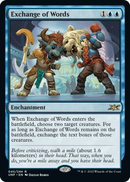【规则】当~进战场时,选两个目标生物。只要~在战场上,将上述生物的文字框互换。