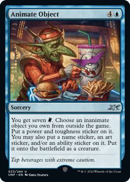 【规则】你获得七张[门票]。选择一件游戏之外的你拥有的不会动的物品。在它上面贴一张力量和防御力贴纸。此外你可以在它上面贴一张姓名贴纸,一张艺术贴纸,和/或一张异能贴纸。将它作为一个生物放进战场。