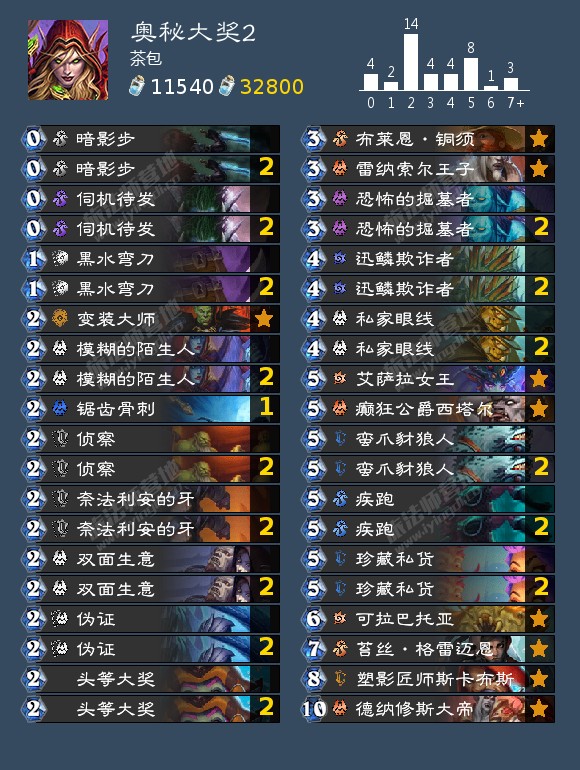 这套牌原版是我抄IG、syf的,(在虎牙播,大家可以关注一下),这两天改了一张,将骨刺替换成了铜须,会降低对抗奇迹贼奇迹牧的胜率(因为更难伺机待发骨刺变身了),但增加了内战和对抗德鲁伊的胜率,考虑到整体天梯环境,我觉得是更赚的(当然我样本不多,大家可以自由选择)。今天大概有6~7局靠铜须取胜,印象深刻的有一把内战,双方都变身后大帝暗影步叫杀,我铜须大帝秒了,还有一局对抗超凡德,他有258,准时超凡,但我用铜须343暗影步掀光了他的手牌平推了,还有一局裸铜须,女王双巨型拿下。