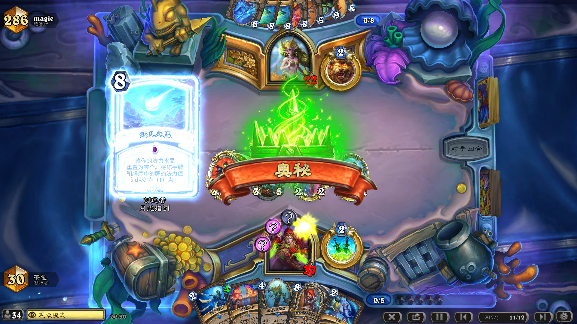 相比第一种,这才是赢下德鲁伊的大多数画面,这里要延展一个小话题,关于奥秘的选择。首先对抗德鲁伊不能无脑选择紫色奥秘,而是要考虑以对方的血量手牌,他是不是还能硬抗一轮,下回合再启动/解场,如果能,那可以用非异议/法反去骗,如果对方明显血量不支持测奥秘,那就老实选择对自己场面有帮助的,还有一个小tip,8费如果没有找到法反和冰霜阻止超凡,建议选择绿色奥秘,因为从对手角度上考虑,贼不拿法师奥秘而选择更差的猎人一定是因为拿了冰霜,所以可以利用这个心理选择绿色增加可信度。并且牢记德鲁伊的解牌,鳞片绿龙传播944女王团本,要注意注能情况和站位,多数情况下9费的异议德鲁伊是不会防的,同理除非没有更好的打法否则一般不9费挂奥秘诈唬对手。