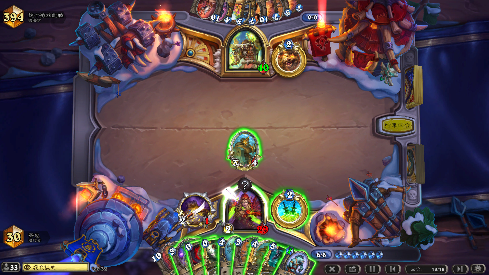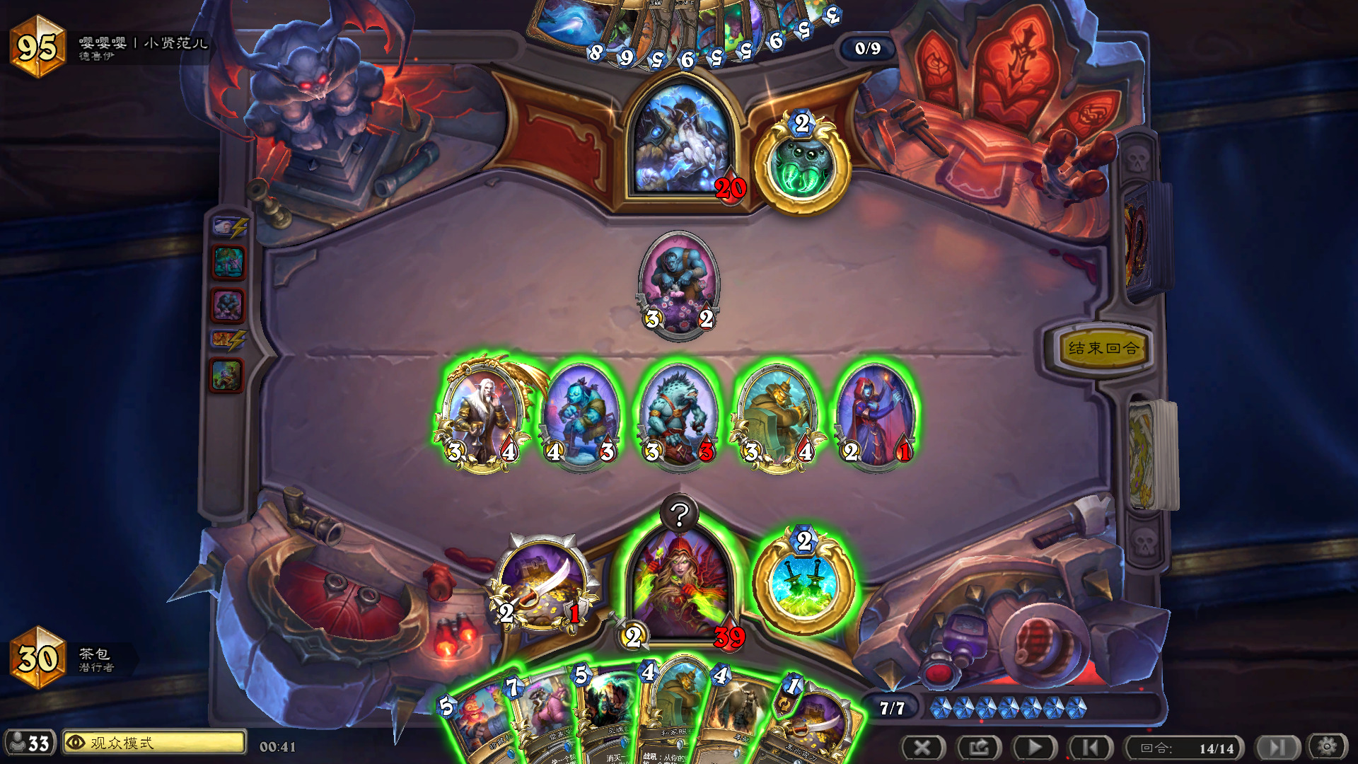 这个对局看似对方是快攻而我们要解场,但实际上是一个我们和术士互抢的对局,因为鬼咒后期的诅咒伤害几乎是远超我们的回复能力的,所以要积极抢脸,高质量的亡语怪不要轻易解场,对方只有30血,随便碰几下就碎了,大部分情况获胜是依靠变身和大帝和侦察质量怪。