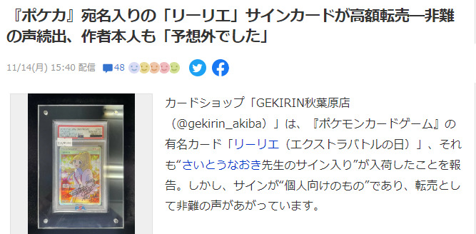 ·网友们惊叹之余,焦点集中在了签名上面,因为之前的天价宝可梦卡几乎都没有原作者画师的亲笔签名,经过一番“人肉”之后,网友找到了签名的来历,是原主人AKIRA在2022年9月25日祈求了SAITO的签名后,仅仅不到两个月就被高价倒卖了,重点是AKIRA在祈求签名时曾信誓旦旦的表示“会珍藏一生”,激发了网友们的怒气。