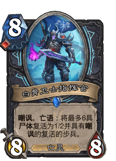 我认为的血符文最强单卡,首先他只要一红,这大概率可以作为一个外带体系混入死亡骑士的卡组,太子玩的时候在打到残局的时候是可以靠这张牌的场面压死对手获胜的,而且本身这个8-8身材的本体也带嘲讽+打出的时候大概率可以拉满场面(太子在中期打的时候是会刻意留意尸体的数量防止影响这张牌的效果)。他最大的优点还是可以以**之力为伟大的德纳修斯大帝进贡多达7个频率,完美契合卡组思路。