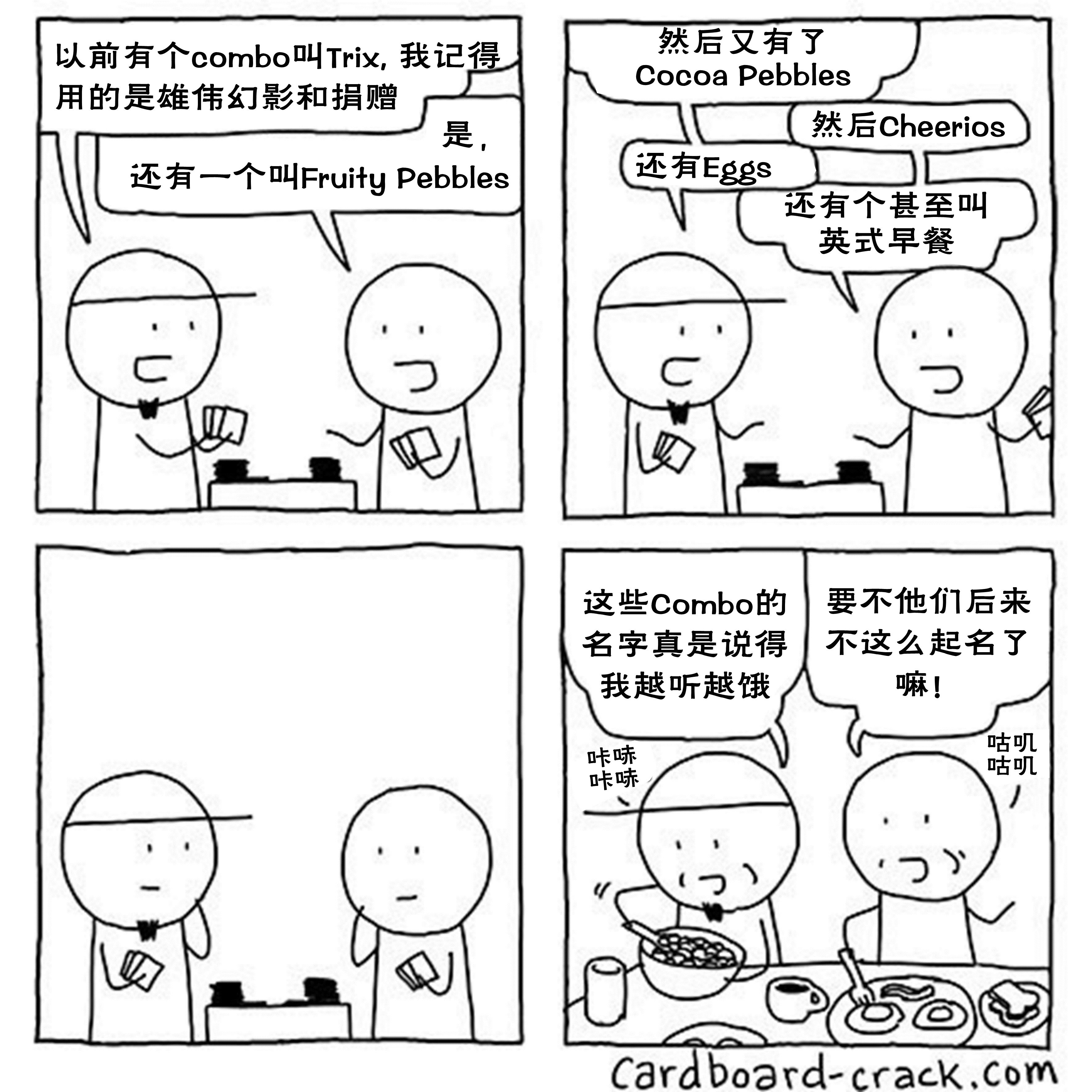 - Cheerios也是美国一个麦片牌子,是风暴卡组的一个亚种。这个combo的核心思路是用大量0费咒语过穿牌库、累积风暴数。同样因为“0”看起来像这种麦片脆圈儿,所以得名(懒得上图了……)