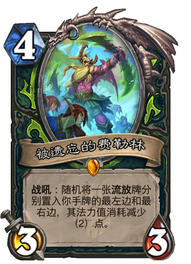 战吼:随机将一张流放牌分别置入你手牌的最左边和最右边,其法力值消耗减少(2)点。