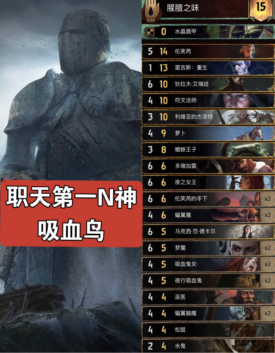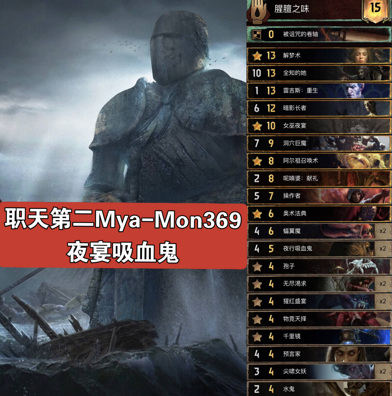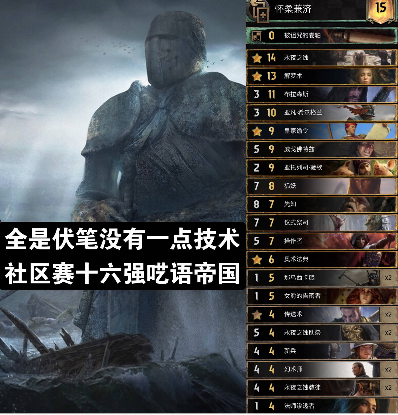 主要思路就是R1拍4P5助祭,利用传送术和死灵术多次灌注呓语词条,一般用指令灌注2次及以上,然后拍剧情(没上手就解梦或者69姐或者法典拉解梦,实在没有就R1早点润),看对面卡组选择用不用领袖速读,然后拍薇歌找2张呓语配合第二章可以很大或者随便一张大金读第三章,之后拍一些呓语单位,基本上每张都是10多20点赢R1。