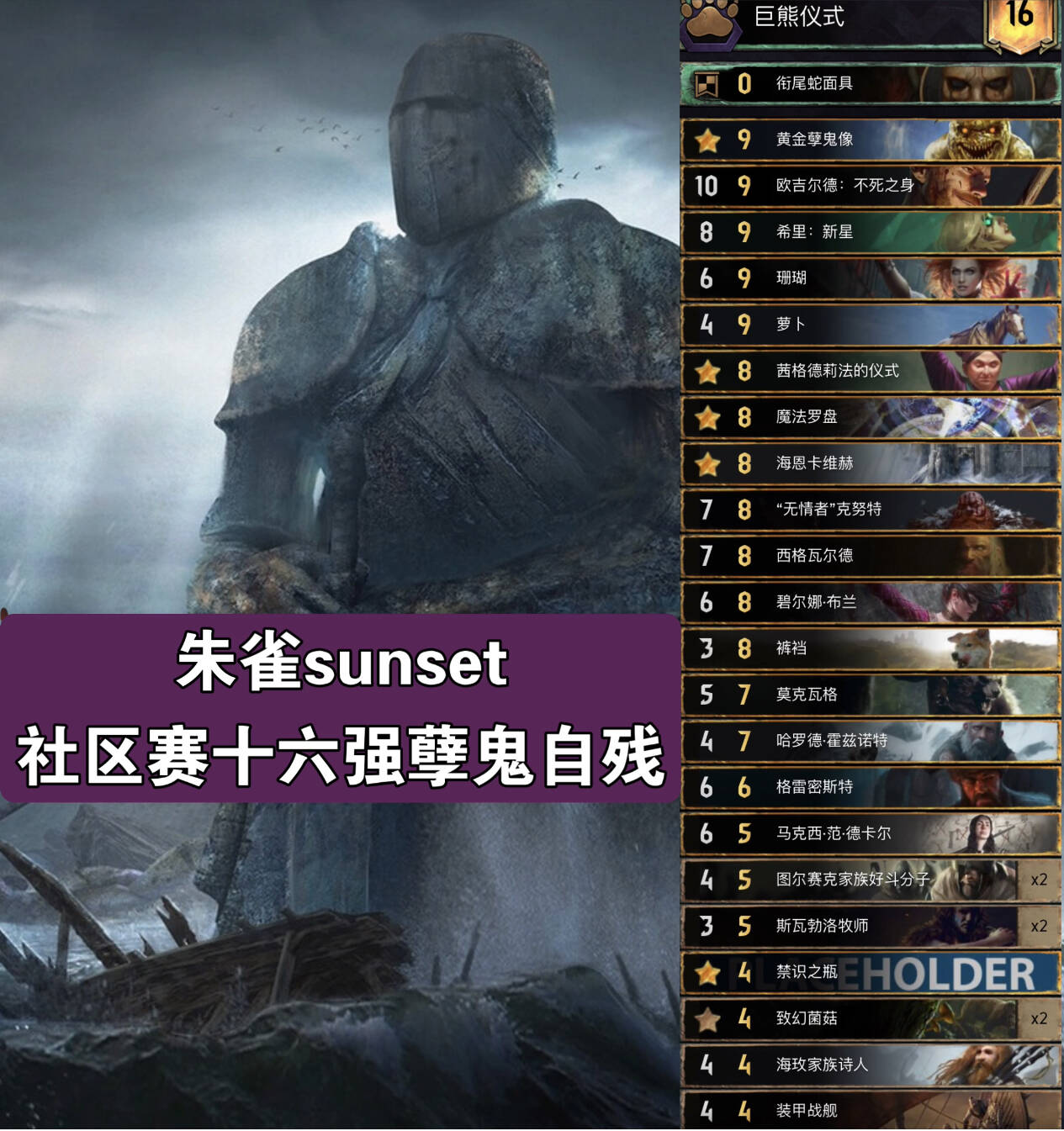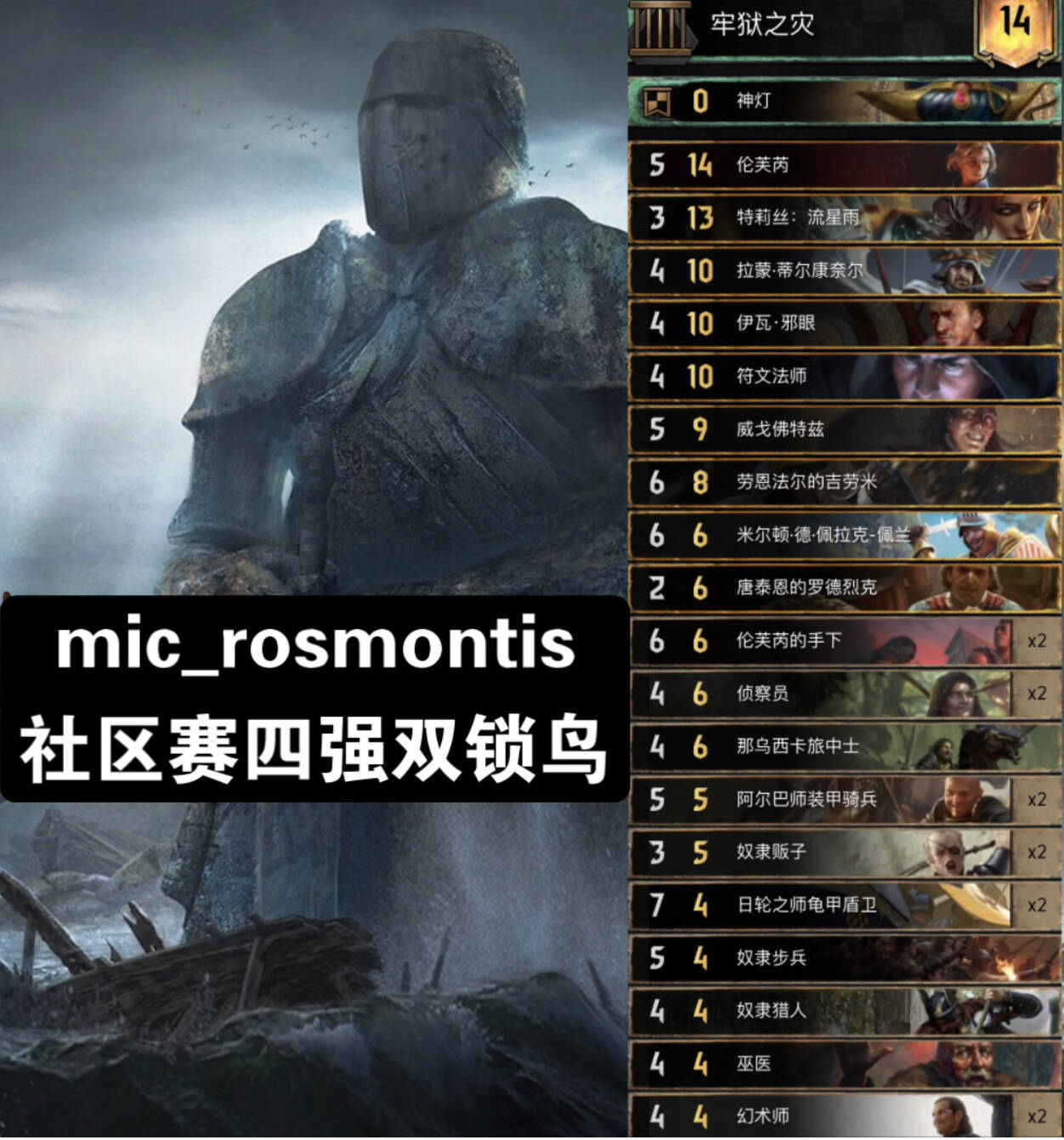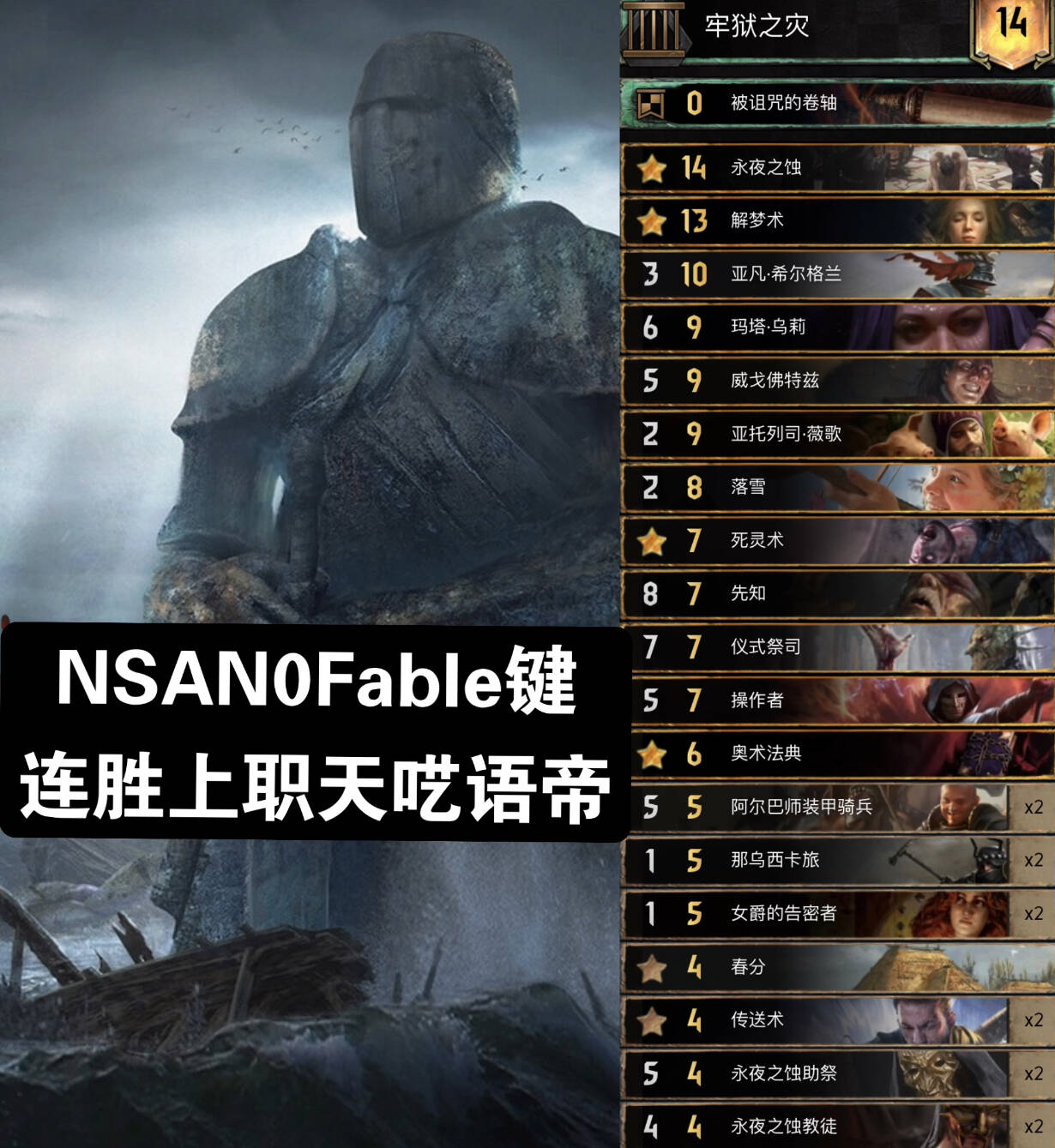 主要思路就是R1拍4P5助祭,利用传送术和死灵术多次灌注呓语词条,一般用指令灌注2次及以上,然后拍剧情(没上手就解梦或者69姐或者法典拉解梦,实在没有就R1早点润),看对面卡组选择用不用领袖速读,然后拍薇歌找2张呓语配合第二章可以很大或者随便一张大金读第三章,之后拍一些呓语单位,基本上每张都是10多20点赢R1。