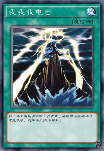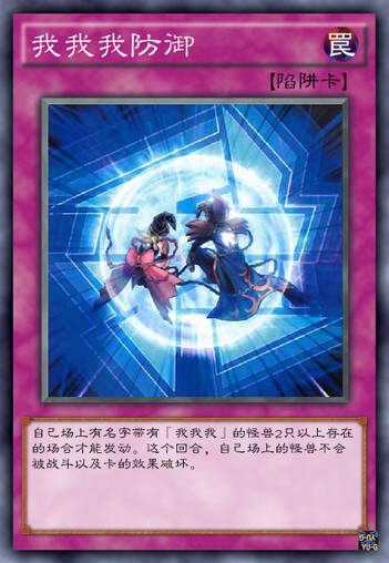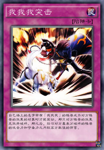 自己场上的名字带有「我我我」的怪兽成为对方怪兽的效果的对象时才能发动。那只对方怪兽的效果无效并破坏。那之后,给与对方基本分破坏的怪兽的攻击力和守备力之内较高方数值的伤害。