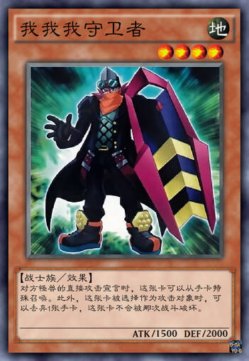 虽然卡图中看不到,但是从游戏王ZEXAL的漫画和动画中可以看到这只怪兽的背上写着“我”字。
