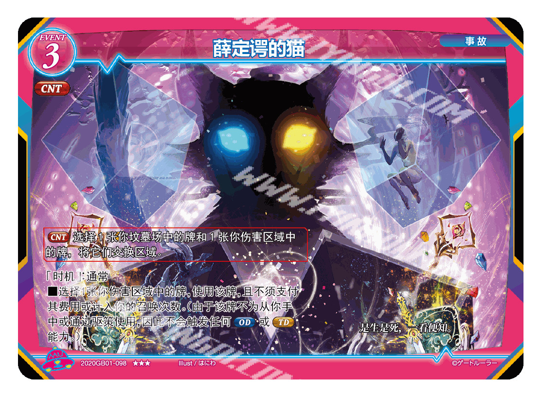 薛定谔的猫在触发cnt效果时,可以通过将坟墓场中其余的薛定谔的猫转移至伤害区,在后续主动使用薛定谔的猫时,可以多次使用伤害区中的薛定谔的猫达到多次回血的目的。