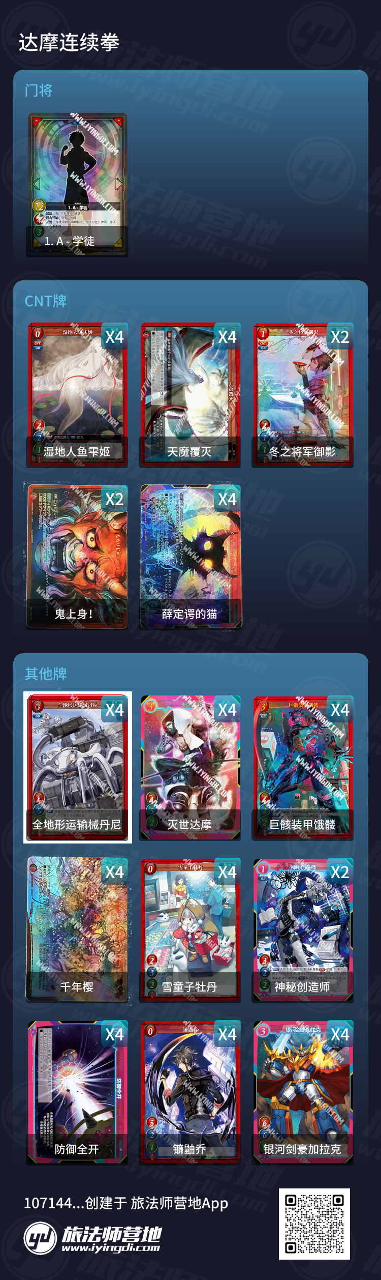 圣者或是疯子,场面运营或是疯狂进攻,本卡组就像灭世达摩一样阴晴不定、诡谲变换,一切都在你的一念之间。现在,就请驱策灭世达摩夺取属于你的胜利吧!以上便是本期的全部内容了,希望能为广大牌手提供一些思路,感谢大家的支持。作者牌力尚浅,本文章旨在给大家提供构筑思路而非最优构筑选择,若有问题欢迎指出。欢迎感兴趣的小伙伴加群678608169,一起探讨Gateruler门将卡牌。