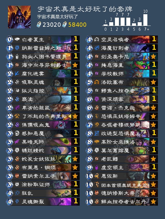 大家好,我是一名普通的回坑狂野玩家,战网id:TheWitchKing#5909,在10月中旬回坑,并在本月使用宇宙术与快攻暗牧打到了最高219,到目前恶魔宇宙术本月战绩(胜/负)35/26,总219场53.8%胜率,因是月初,排名也确实不高,而且之后也因为环境的变动一路连跪掉到了1200,所以本文只是进行思路的研讨,起抛砖引玉的作用,博大家一乐。但因为之前没有写文章的想法,也没有想过会连跪,故基本上没有对局截图和排名截图……我会在接下来的正文中从构筑谈起本卡组的思路,同时进行一定的对局分析,鉴于本人能力有限,不足之处希望大家支持,还请各位老哥多多谅解。同时,如果你是一名想抄卡组上传说的玩家,我更建议你选择目前主流的偏节奏的宇宙术甚至别玩宇宙术,玩宇暗,而不是这套仍然处于完善阶段的卡组。反正国服快没了,分什么的也不重要了所以都来玩这套吧