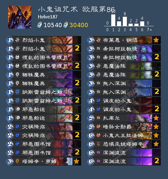 小鬼诅咒术在这个环境中中期较为僵硬的毛病显露无疑,如果不能在前期依靠慌乱的图书管理员和邪恶图书馆抢下足够的血量,那么就很容易被现在的德、贼混到自己的强势期,或者被奇迹卡组莫名奇妙一波展开打爆。小鬼园则属于是快攻德的下位替代……
