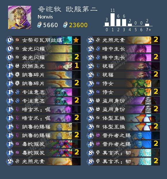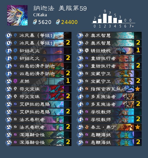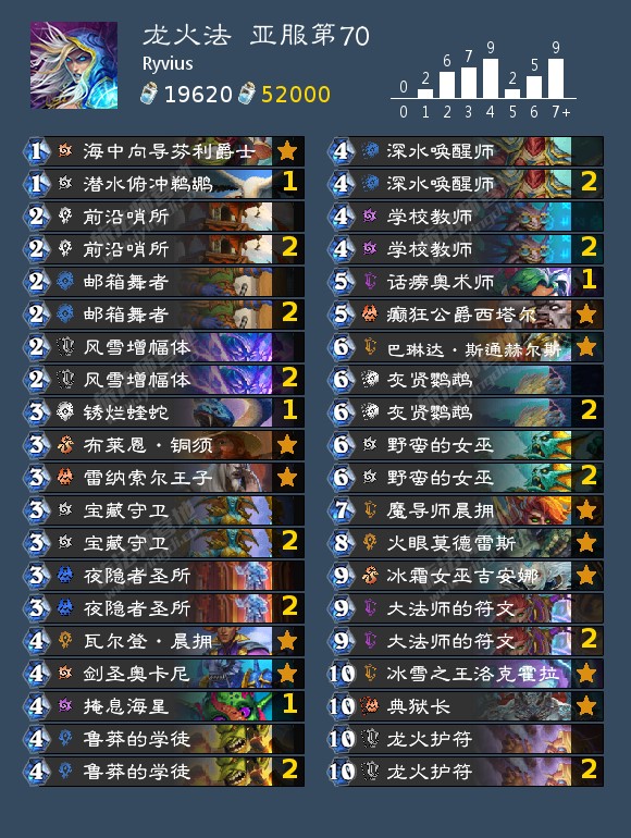 +雷纳索尔王子、剧毒魔蝎*2、深水唤醒师*2、癫狂公爵西塔尔、暴风雪*2、灰贤鹦鹉*2、群体变形、冰霜女巫吉安娜、大法师的符文*2、德纳修斯大帝