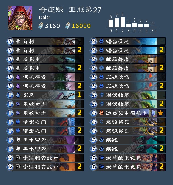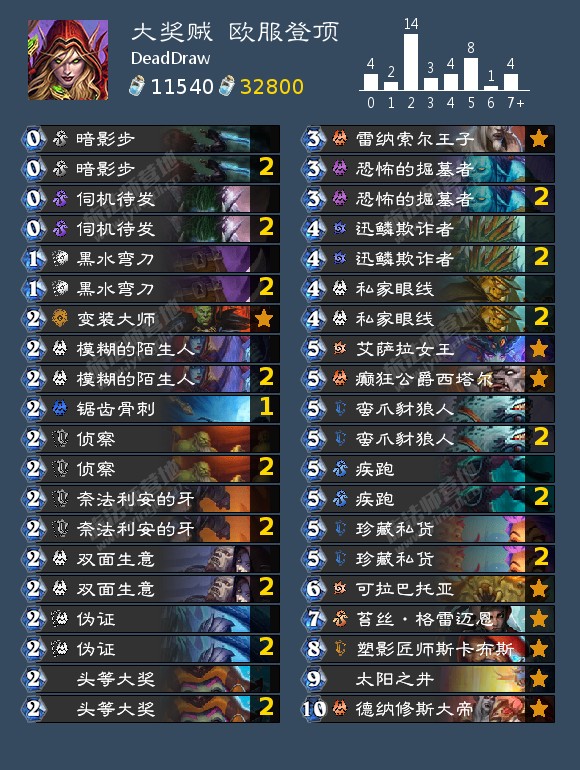 大奖贼又双叒叕回到了它忠实的天梯。目前主流的大奖贼已经确定了38张牌,最后两个卡位的竞争者有第二个模糊的陌生人、第二个锯齿骨刺和太阳之井。考虑到现在的大奖贼如果牌序比较不错时可能会出现手牌不足的问题,太阳之井这么一个三四费的补牌其实还相当不错(当然存在着方差较大的问题,但是我感觉四五张牌里至少会有一两个有用的),个人认为它还是可以成为大奖贼核心构筑之一。至于第二个模糊的陌生人和第二个锯齿骨刺之间的选择……我认为应该取决于环境,如果你所在的环境中快德等有小怪的卡组比较多的话锯齿骨刺更好,不然的话我觉得模糊的陌生人更强。前面说到了“大奖贼如果牌序比较不错时可能会出现手牌不足的问题”,但是其实大奖贼也很容易会陷入手牌过多的窘境……因此也有一些大奖贼会选择单双面生意单私家眼线的构筑,这样一来就可以同时带这三张卡,还能多一个卡位给你喜欢的牌。